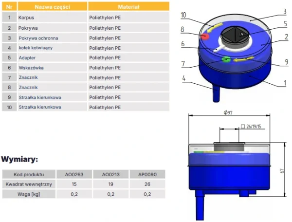 Element montowany na obudowach stałych lub teleskopowych, służący do wskazywania aktualnego położenia klina zasuwy. Wykonany w całości z trwałego tworzywa PE.