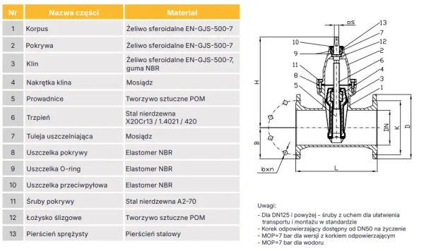 Zasuwa z żeliwa sferoidalnego z klinem ogumowanym NBR, przeznaczona do sieci gazu ziemnego i mieszanin z wodorem. Certyfikaty CE, INiG, DVGW, BSI Kitemark. Ciśnienie robocze MOP 16 bar (7 bar dla H₂). Powłoka epoksydowa min. 250 μm.