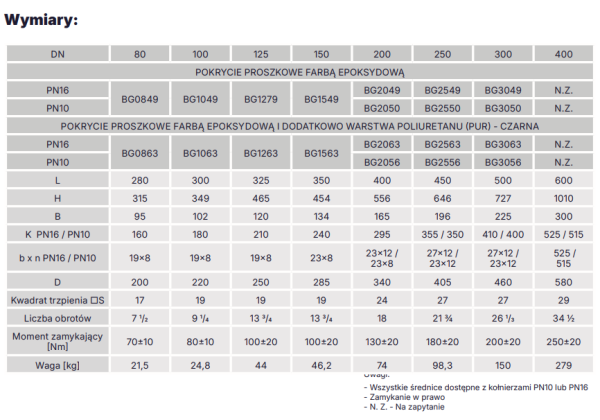 Korpus pokryty jest powłoką epoksydową ≥ 250 μm, a na życzenie dostępna jest wersja z powłoką poliuretanową PUR zgodną z PN-EN 10290. Zasuwa spełnia wymagania norm PN-EN 13774, DIN 3230-5, GIS/V7-1, a jej kołnierze wykonano zgodnie z PN-EN 1092-2 (PN10/16).