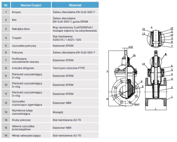 Kołnierzowa zasuwa wodna z żeliwa sferoidalnego, pełnoprzelotowa, z klinem w pełni ogumowanym EPDM. Przeznaczona do sieci wodociągowych i instalacji wody pitnej. Certyfikaty PZH i WRAS. Ciśnienie robocze PFA 16 bar, powłoka epoksydowa min. 250 μm.